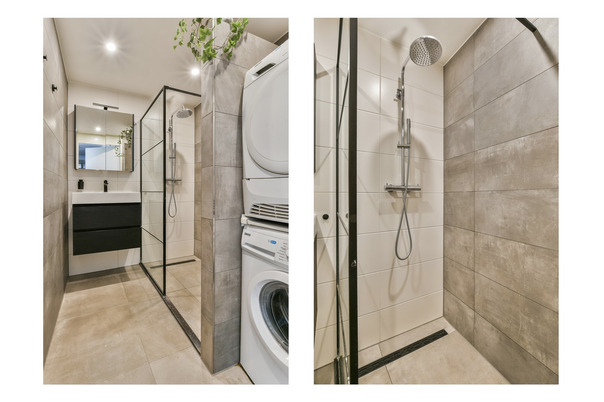 De badkamer is gemoderniseerd en luxe uitgevoerd met een inloopdouche, een modern wastafelmeubel en een aparte nis voor de wasmachine en droger. De combinatie van moderne wand- en vloertegels geeft het geheel een verzorgde en eigentijdse uitstraling.
