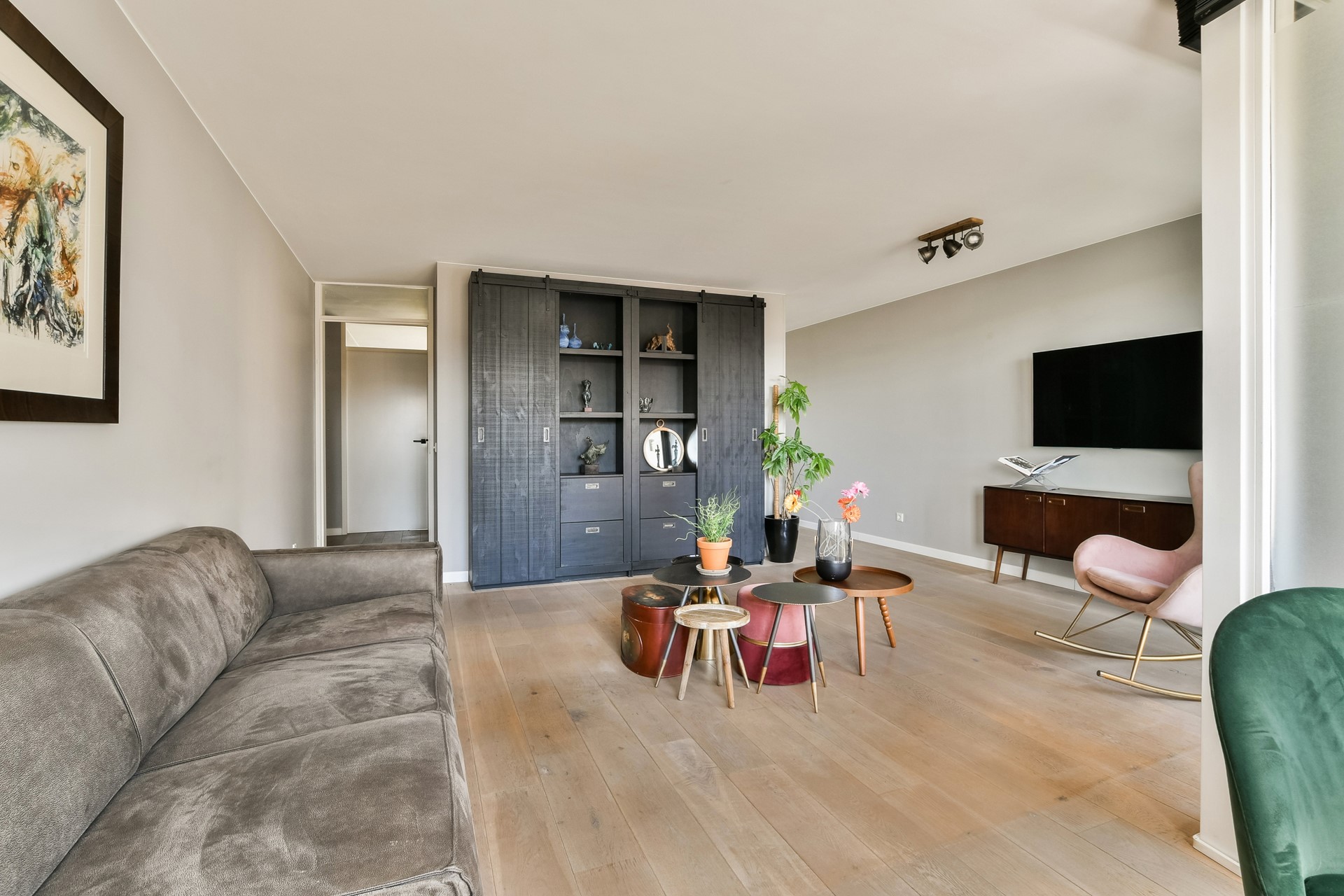 From the hallway, you enter the spacious and bright living room with direct access to the sunny south-facing balcony – a lovely place to enjoy the sun. The living room, like the kitchen, is finished with an attractive wooden floor that adds warmth and atmosphere.