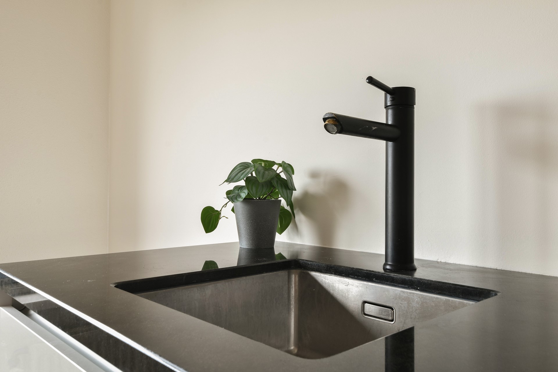 De keuken aan de achterzijde heeft een stenen werkblad en is voorzien van diverse inbouwapparatuur.