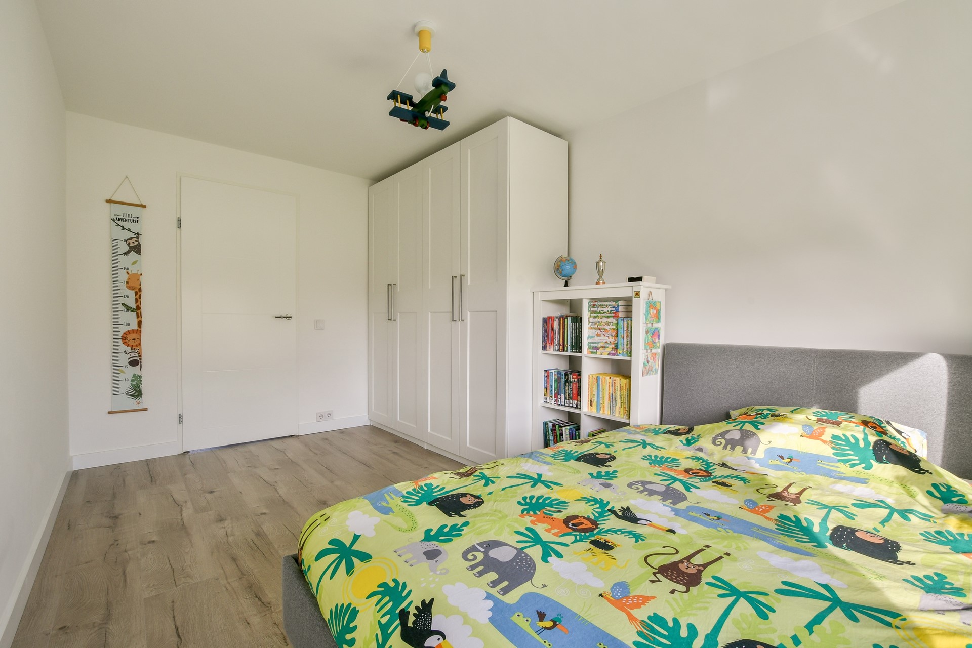 Op de tweede verdieping liggen drie grote slaapkamers, twee aan de tuinzijde en één aan de voorkant van de woning. De centrale badkamer is modern uitgevoerd met een ruime inloopdouche en een elegant wastafelmeubel met dubbele wastafel. Op deze verdieping bevinden zich tevens een separaat toilet en een praktische wasruimte met plek voor een wasmachine en droger.