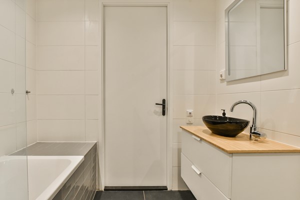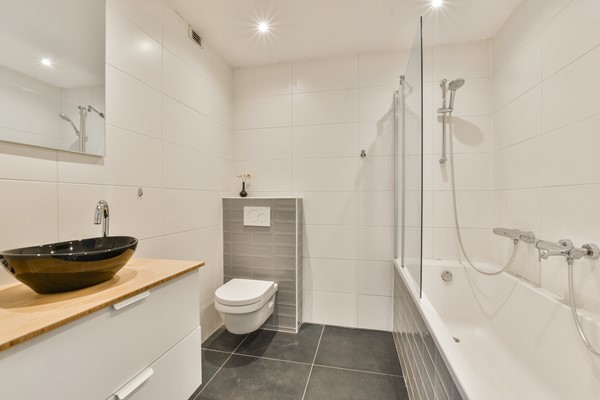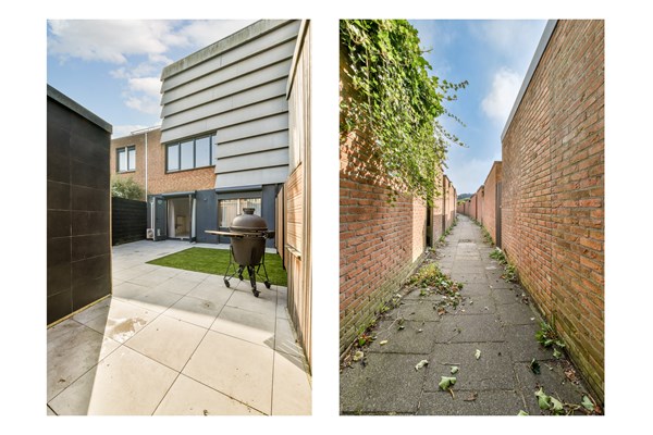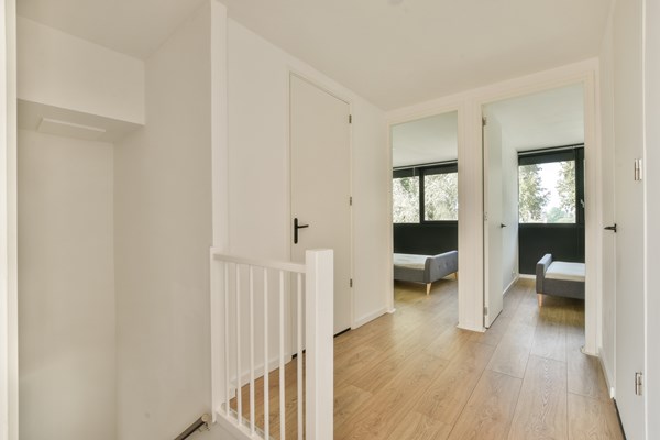 Door de fraaie entree op de begane grond neem je de trap naar de eerste verdieping, waar je aan de voorzijde de royale woonkamer vindt en aan de achterzijde de open keuken. Grote raampartijen zorgen voor veel lichtinval en prachtig uitzicht. In het verlengde van het woongedeelte bevindt zich een royale eetruimte met een moderne keuken. Op de tweede verdieping tref je 3 slaapkamers aan, waarvan de grootste ruim 15 m² groot is en toegang biedt naar het dakterras (ruim 12 m²). Ook is er een moderne badkamer met ligbad en toilet en een grote berging met wasmachine aansluiting. De royale inpandige leefruimte op de begane grond van de woning biedt toegang tot de tuin en is voorzien van een open keuken met massief eiken werkblad en quooker, een nette slaapkamer en een moderne badkamer met douche en toilet.