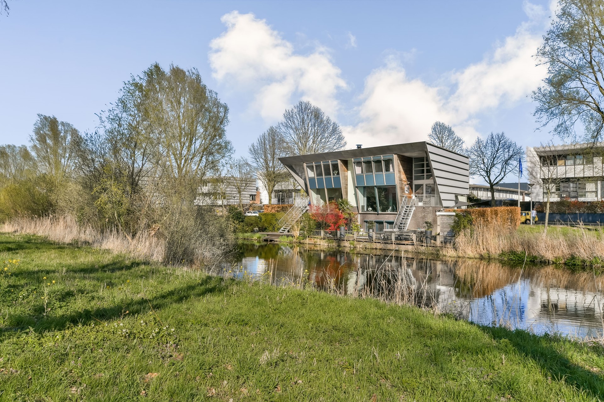 On the edge of Nieuw-Sloten, directly by the water and with unobstructed views over the De Vrije Geer nature reserve, lies this distinctive water villa from 1995. A house that stands out for its architecture, its location, and above all for the seamless way indoor and outdoor spaces flow into each other.