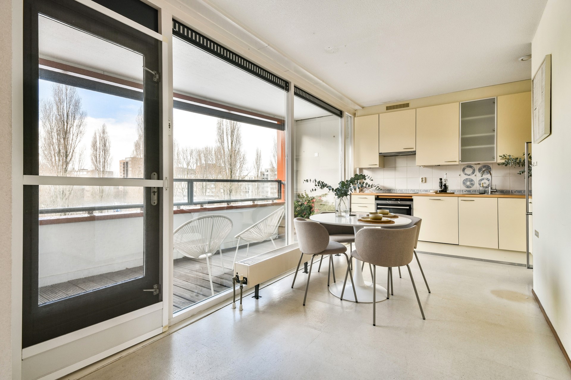 The generous L-shaped living room with open kitchen forms a bright and comfortable living area. The kitchen is functionally designed and equipped with built-in appliances. From the kitchen, you can step directly onto the balcony, which is over 5 metres wide and offers unobstructed views of the park. Due to its west-facing position, the balcony enjoys sunshine from the afternoon until sunset, making it a pleasant and sheltered spot for relaxing or dining outdoors.