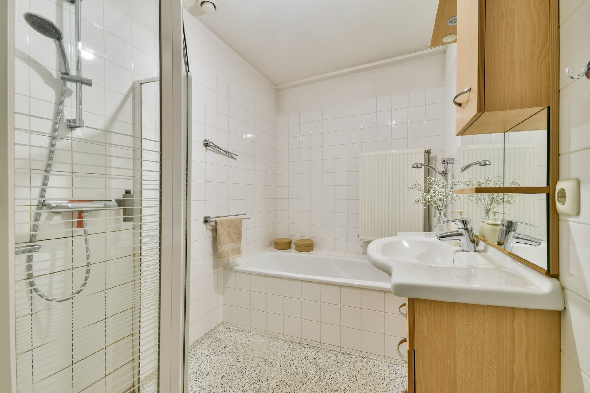 The apartment has two well-proportioned bedrooms. The main bedroom easily accommodates a double bed and large wardrobe. The bathroom is practically laid out and fitted with a bathtub, shower and washbasin. The toilet is separate and accessible from the hallway.
