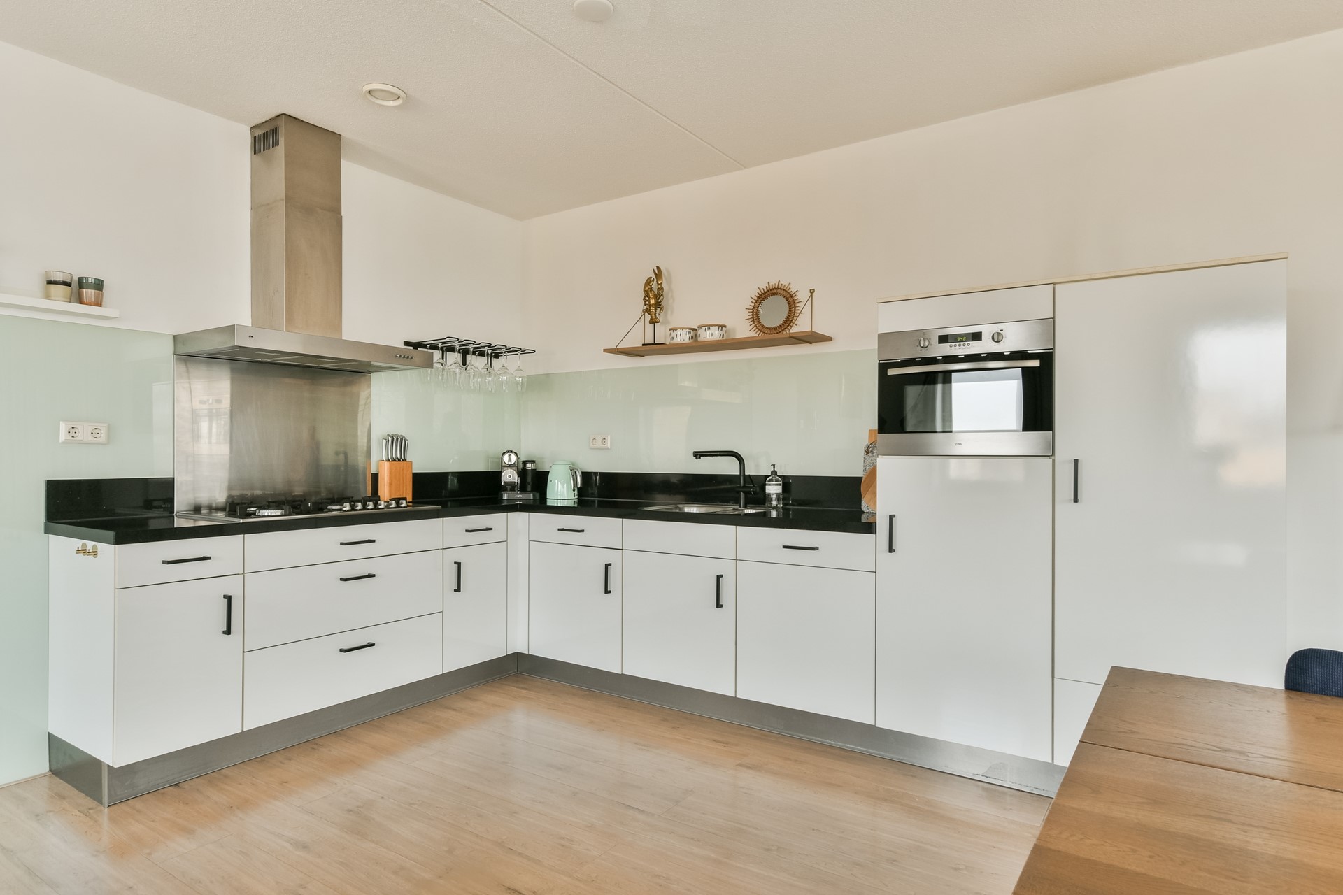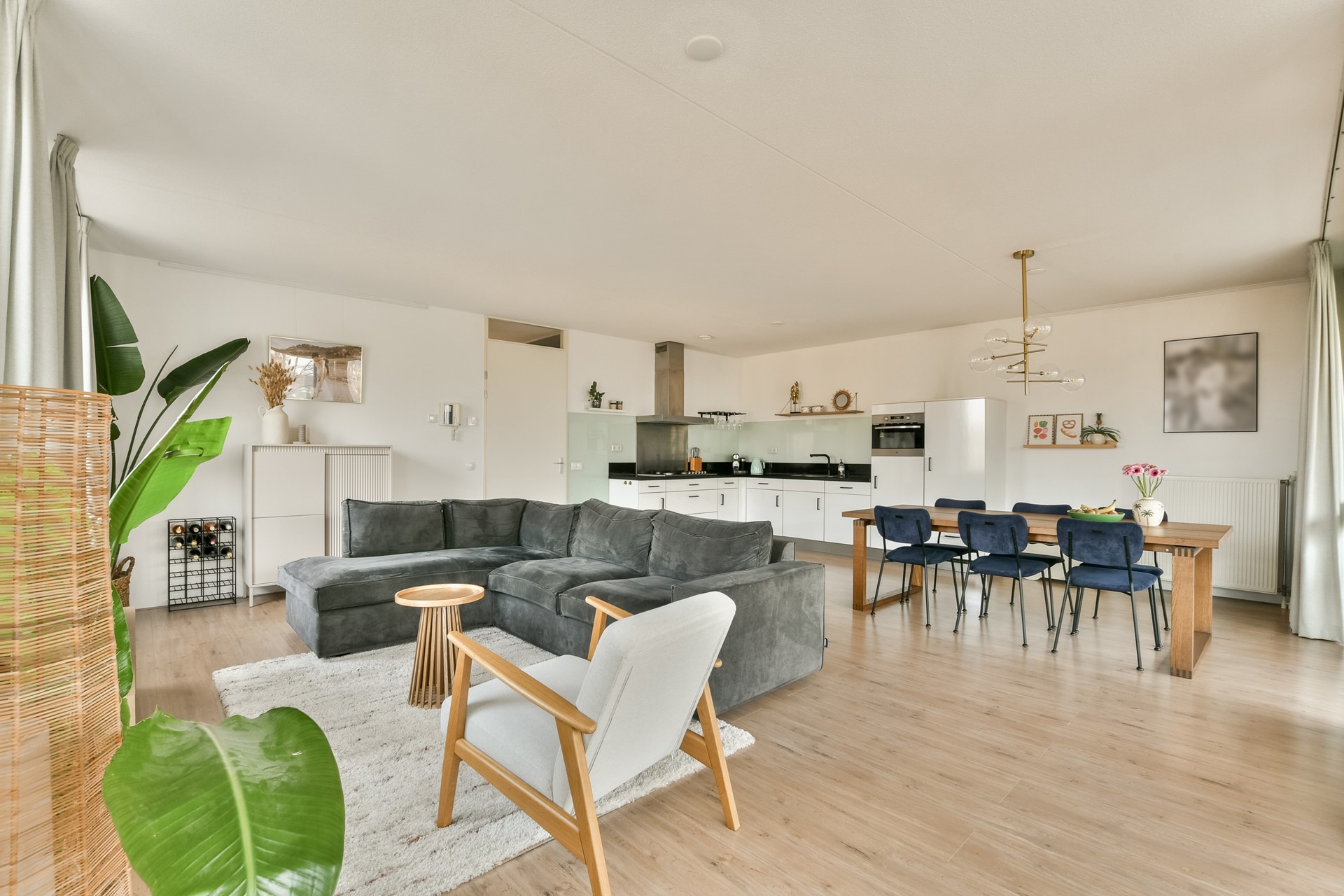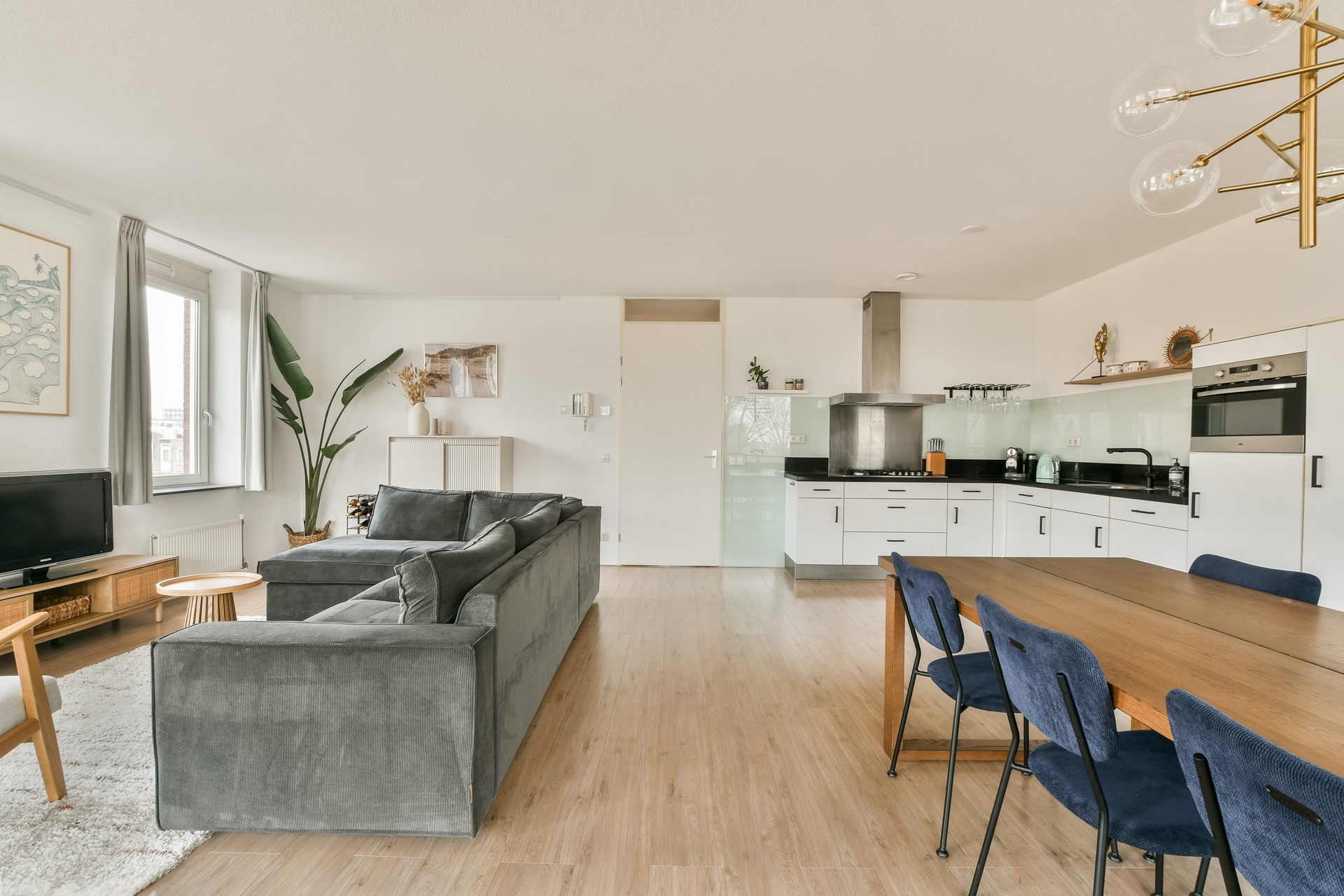 De ruime woonkamer met open keuken is heerlijk licht dankzij de hoekligging en de vele ramen. De moderne keuken is opgesteld in een praktische hoekopstelling en voorzien van diverse inbouwapparatuur, waaronder een vaatwasser, 5-pits gasfornuis, combi-oven, afzuigkap en koel/vriescombinatie. Vanuit de woonkamer heb je directe toegang tot het royale balkon.