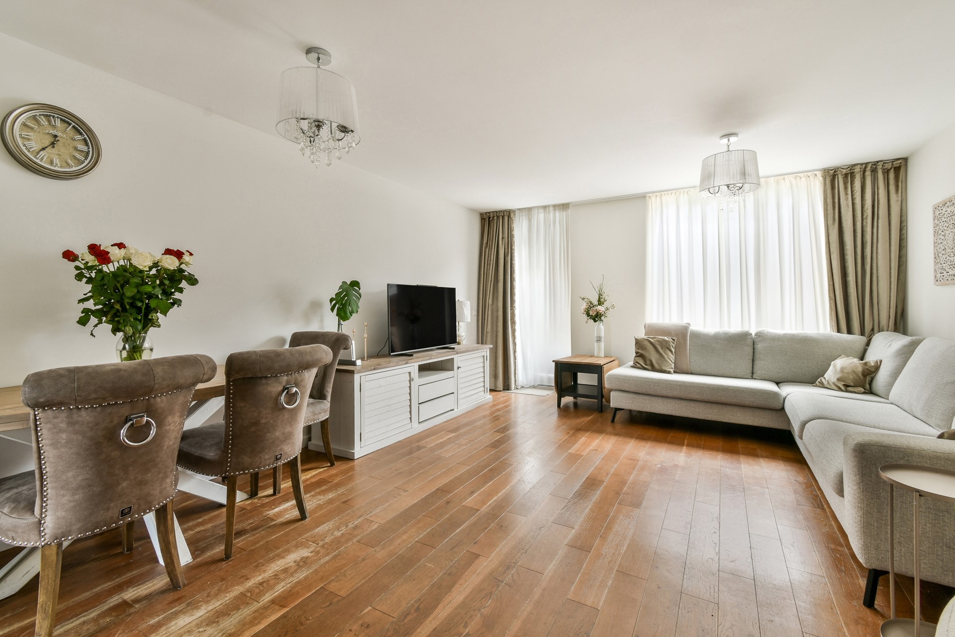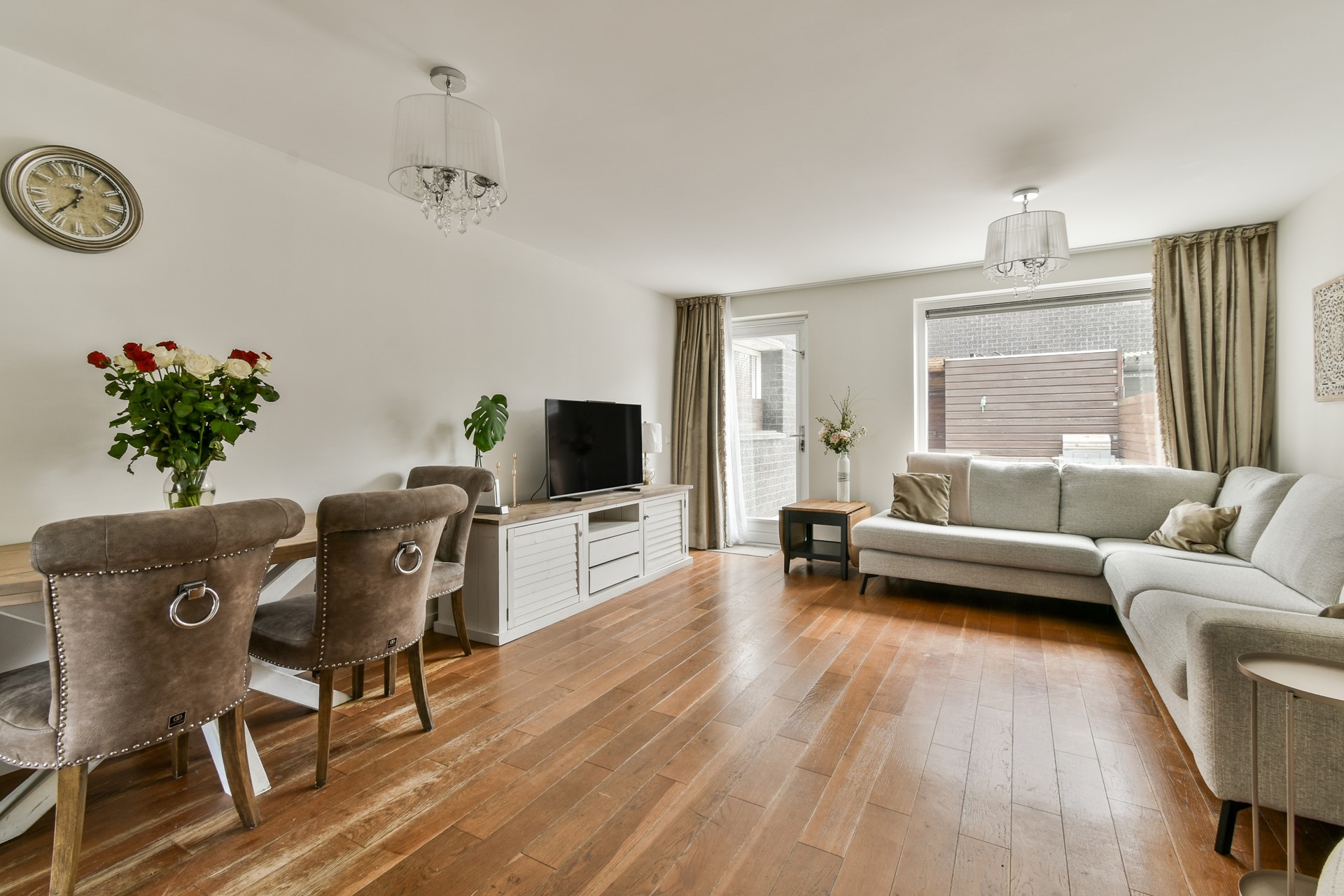 The living room has an oak wooden floor and includes a practical storage space underneath the staircase.
