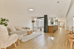 De royale en lichte woonkamer biedt volop ruimte voor een comfortabele zithoek en een grote eettafel. De sfeervolle eethoek bevindt zich aan de voorzijde en staat in directe verbinding met de patio en het zonnige terras, waardoor binnen en buiten op een natuurlijke manier in elkaar overlopen.