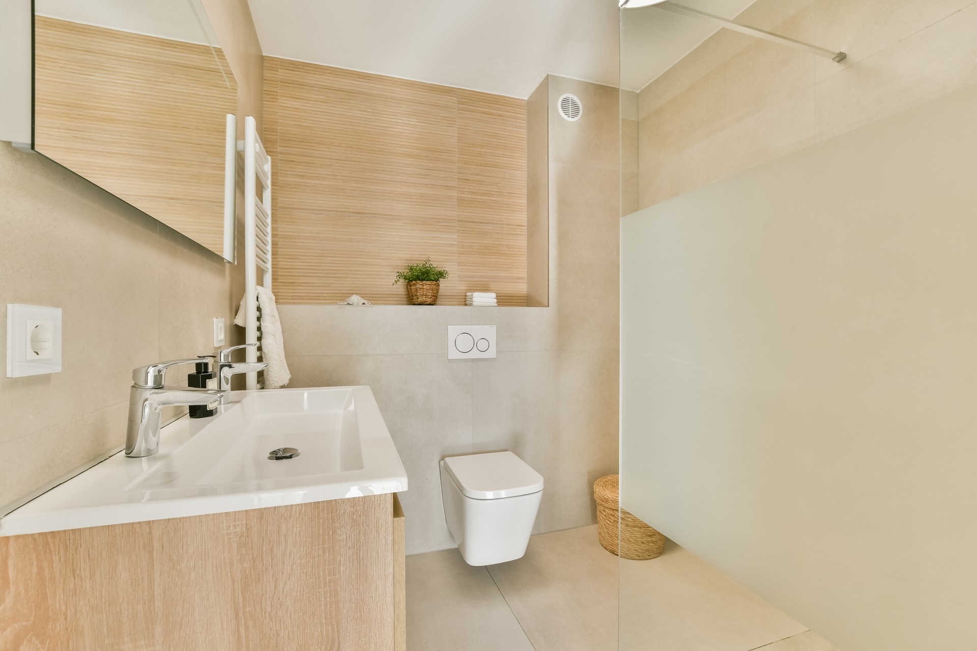 The landing provides access to two spacious bedrooms (formerly three) and a modern bathroom with a walk-in shower, contemporary sanitary fittings and a calm, timeless finish.