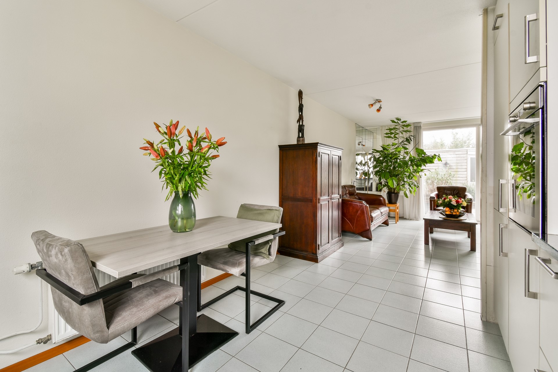 De open keuken bevindt zich aan de voorzijde van de woning en is uitgerust met diverse inbouwapparatuur, een ruim werkblad en voldoende kastruimte.