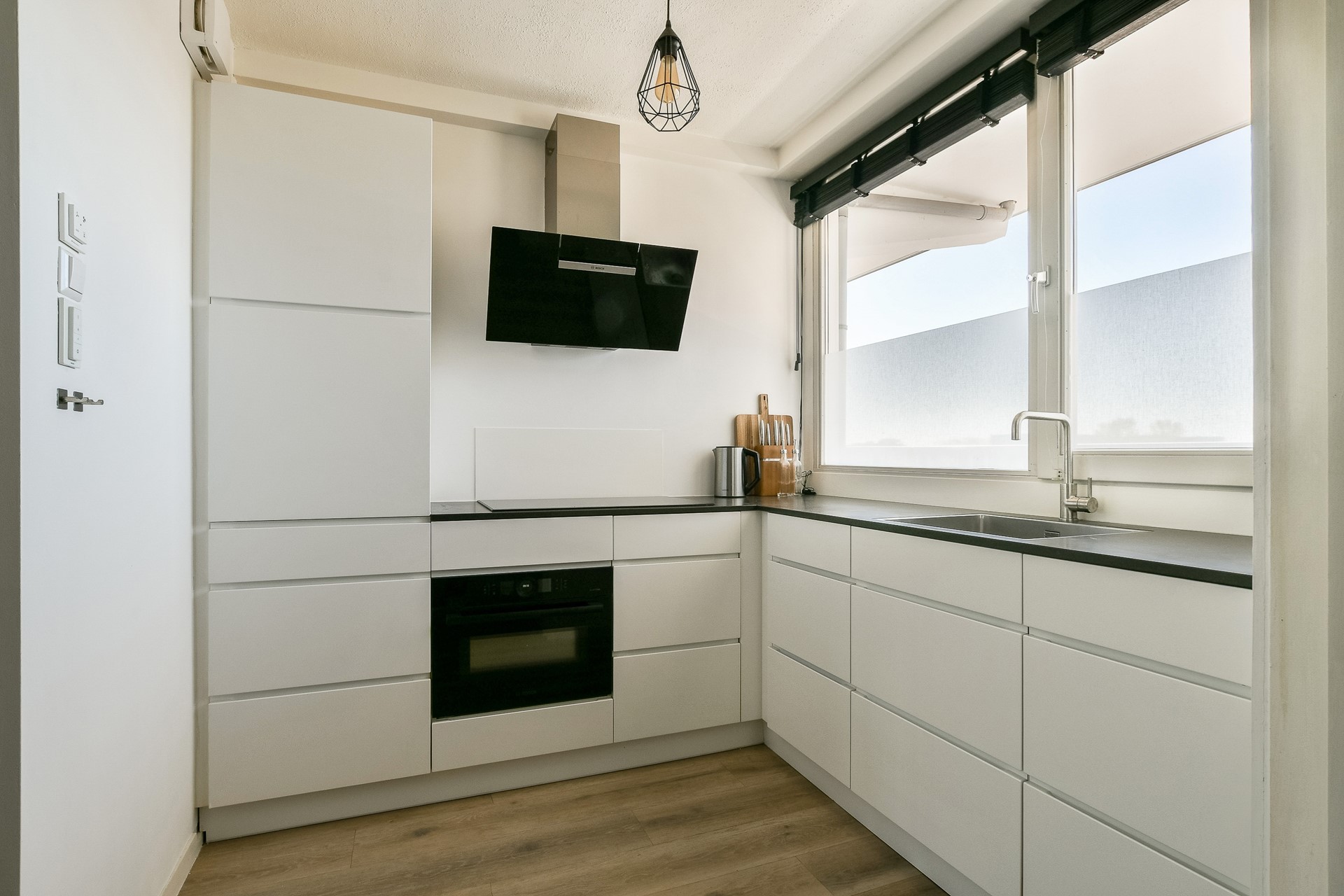 Via the entrance on the fourth floor, you enter the hallway, which provides access to the various rooms. On the gallery side, you will find the modern kitchen (2021), featuring a generous worktop and built-in appliances. The kitchen benefits from plenty of daylight and is practically designed. There is also a separate utility room with connections for a washing machine.