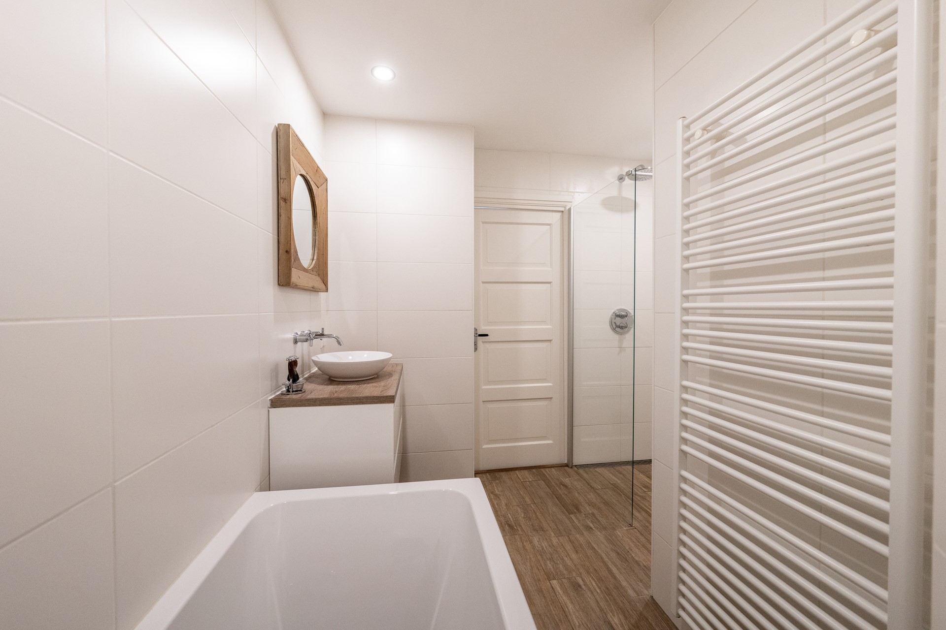 De badkamer straalt een tijdloze elegantie uit met een ligbad, royale inloopdouche en stijlvol wastafelmeubel. Het toilet is separaat.