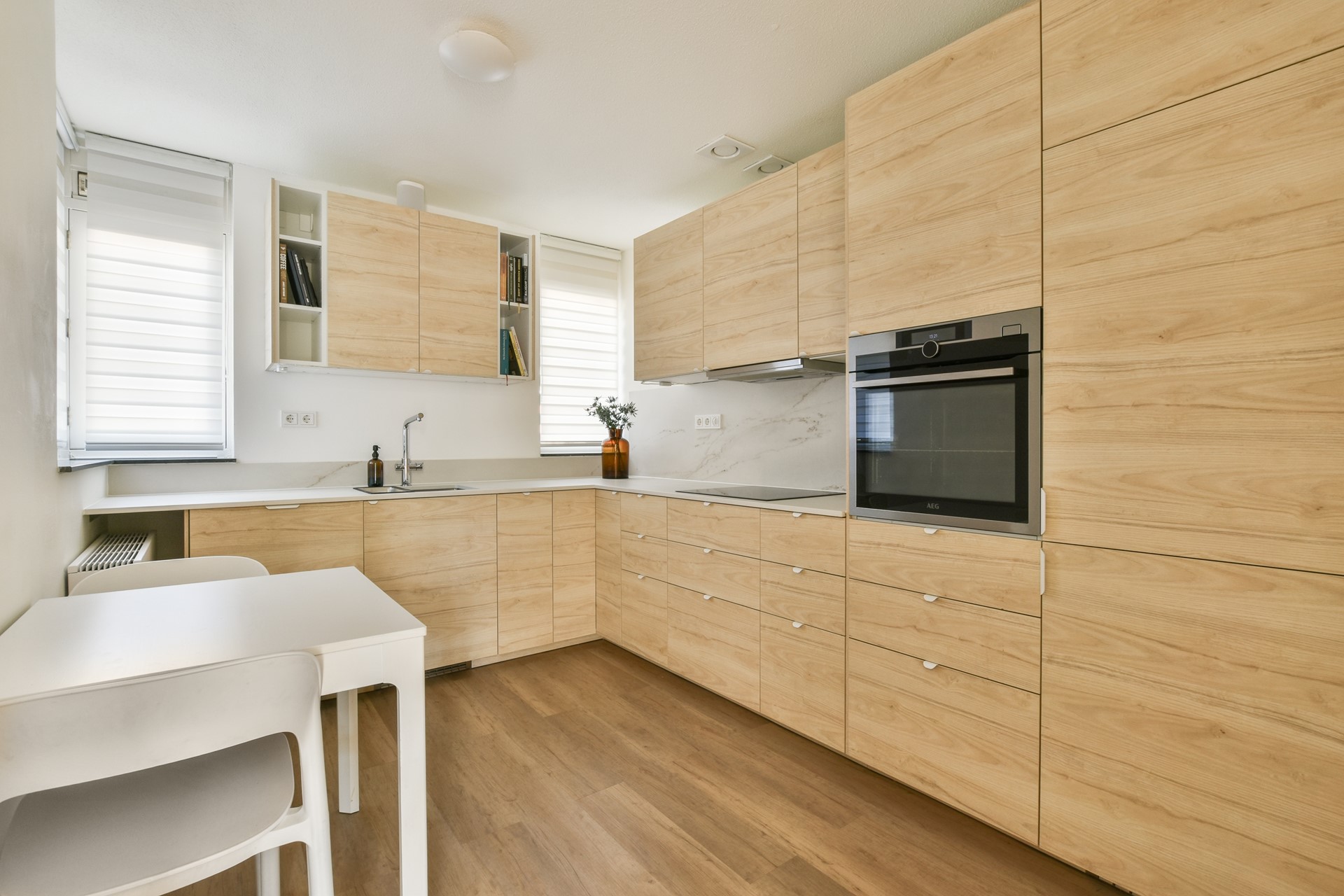 Aan de voorzijde bevindt zich de lichte moderne keuken met veel werk- en opbergruimte. De keuken is voorzien van diverse inbouwapparatuur van A-merken.